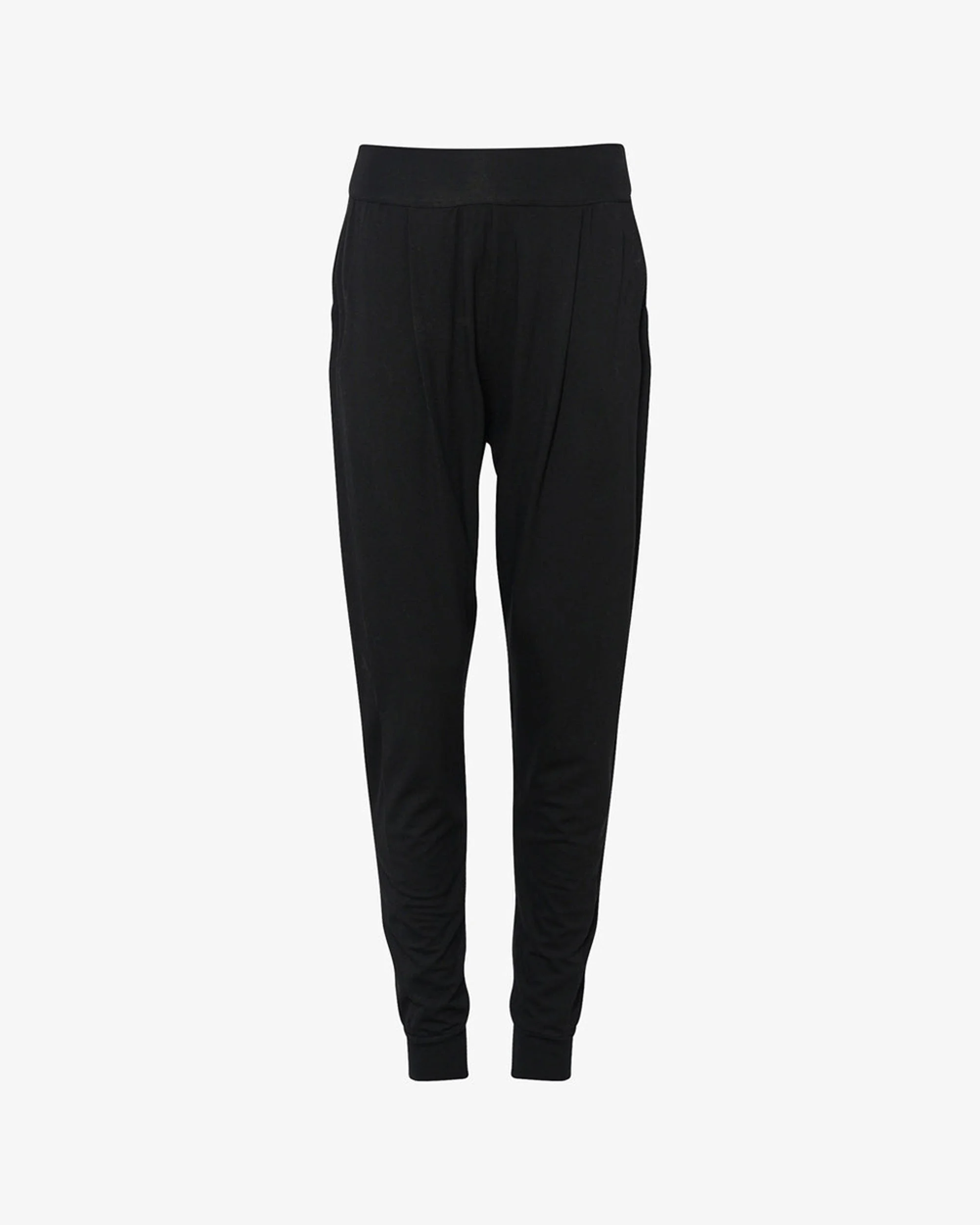 With its relaxed and urban style, these harem pants are the perfect ally for your yoga routine or for effortless, everyday wear. Tightened at the ankles, they easily follow your movements. Loose fit and ankle cuffs Mid-rise waistband Two front pocketsMaterial:Viscose elasthanne Composition:95% Cotton – 5% Elastane Color:Black Original country:Portugal Ref: W0646-410-XS Product details Loose fit. Tight legs bottom. Two front pockets. Silver Repetto logo transfer.The model is 1,69m and wear a S size.