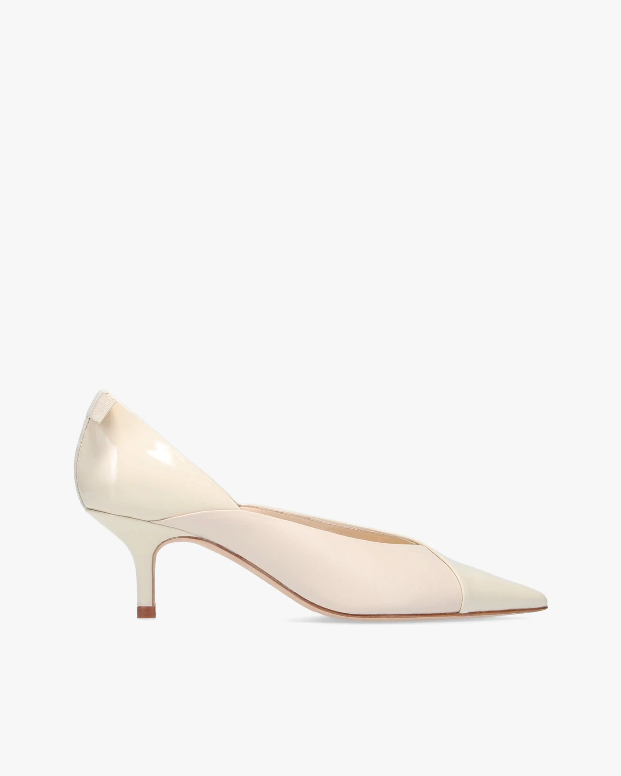 With its heart-shaped construction, recalling the ballet outfit codes and allowing for a play on materials, as well as its grosgrain bow on the back of the heel, the Laurire pump reinterprets the pointed pump while remaining true to the codes of the Maison Repetto. Material: Lambskin and patent leather Color: Swan beige Heels height: 4,5 cm Original country: Spain Details: Lambskin insole and lining. Leather sole. Leather wrapped heel. Cemented construction. Ref: V4211VMTD-1449-35