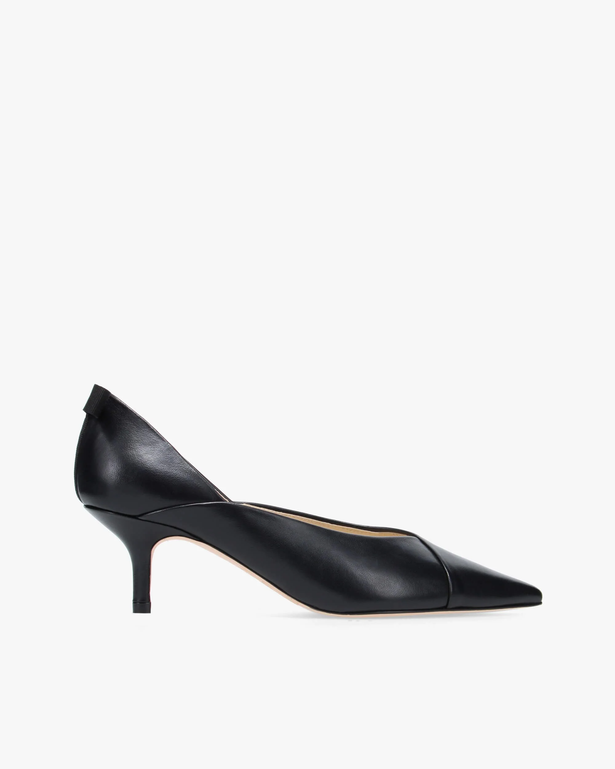 With its heart-shaped construction, recalling the ballet outfit codes and allowing for a play on materials, as well as its grosgrain bow on the back of the heel, the Laurire pump reinterprets the pointed pump while remaining true to the codes of the Maison Repetto. Material: Mixed lamb and goat leather Color: Black Heels height: 4,5 cm Original country: Spain Details: Lambskin insole and lining. Leather sole. Leather wrapped heel. Cemented construction. Ref: V4211MTD-410-35
