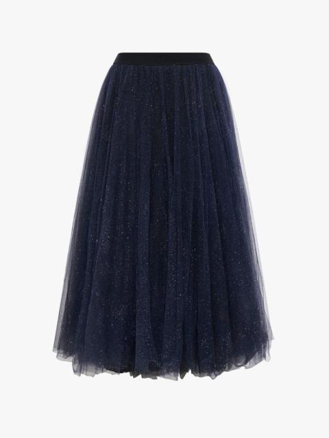 Details: Inspired by Repetto's iconic tutu, this skirt is the urban and elegant interpretation of classical dance attire. Fluid and airy, it is embellished with delicate sparkles for a festive touch. With its midi length and satin elastic waistband, it hints at every movement for a modern and feminine silhouette. • Midi length: 78 cm • Elastic band around the waist • Full lining for opacity Material: Soft tulle Composition: Main: 100% Polyamide Lining: Viscose Color: Blue Country of origin: Tunisia Ref: R0306R-1482-XS Product details Principale : 100% Polyamide Doublure : Viscose