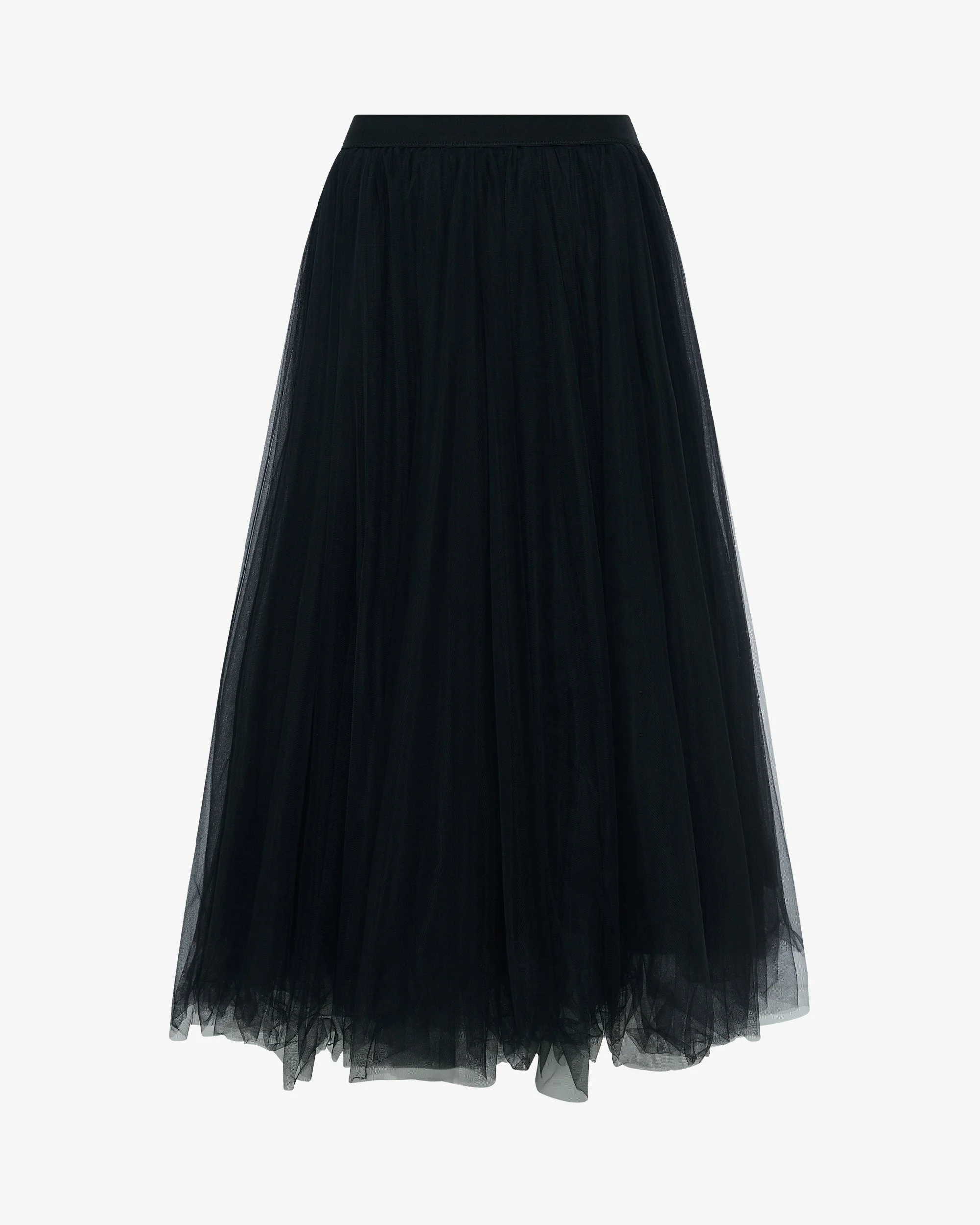 Inspired by the iconic Repetto tutu, this remodeled version of the tutu skirt is the urban and elegant interpretation of the classic dance outfit. Fluid and airy, with its midi-length and satin-finish elastic band around the waist, it suggests all the moves for a modern and feminine silhouette. - Midi length : 78 cm - Elastic band around the waist - Full lining for opacity Material: Soft tulle Composition : 100% Polyamide / Lining : Viscose Color: Black Ref: R0306-410-XS