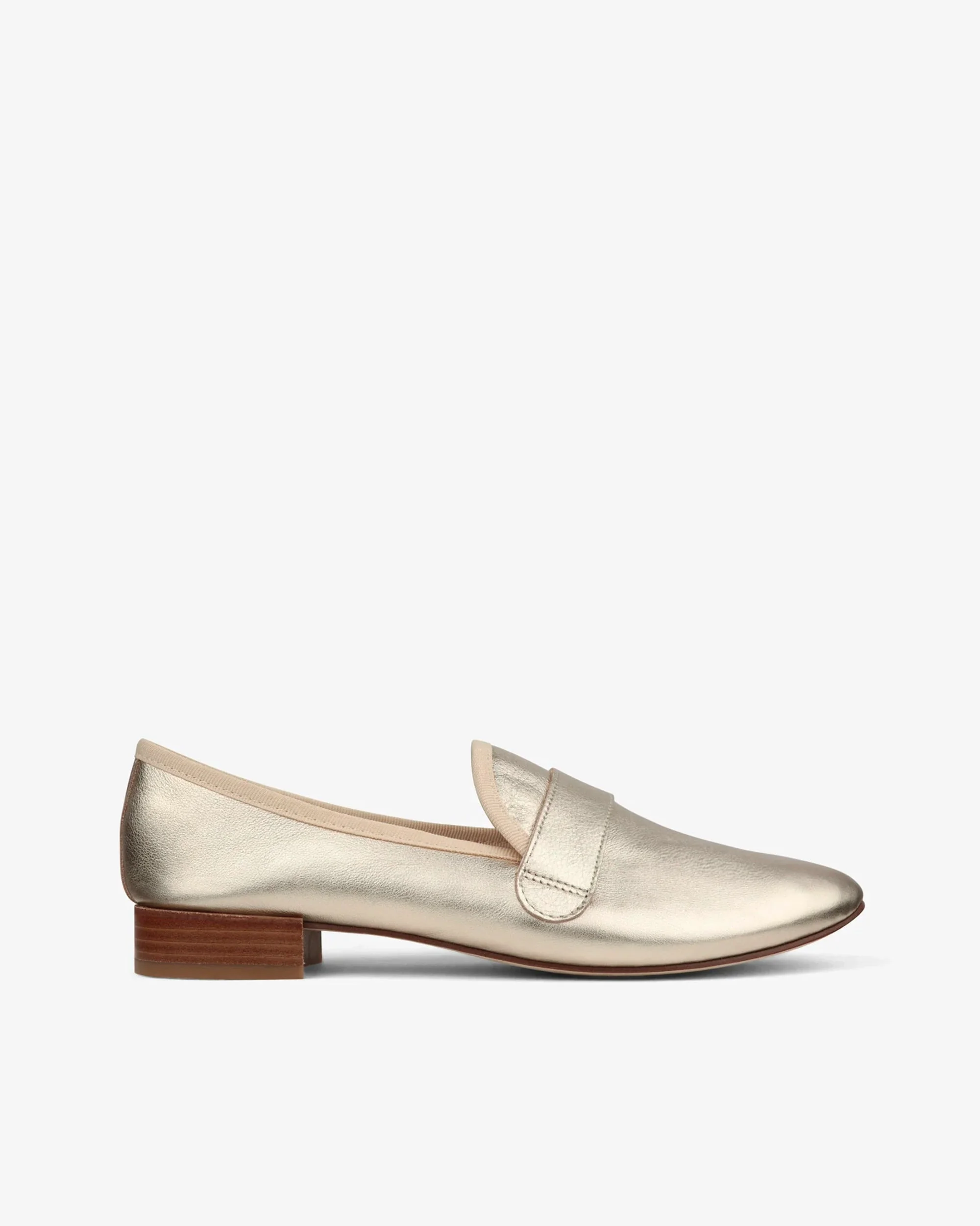 Created in 2009, the Michael loafers, in reference to the king of the dance floor Michael Jackson, is today one of the iconic products of the Maison. Material: Metallized lambskin Color: Light gold Heels height: 2 cm Original country: France Details: Cowhide leather insole. Cotton lining. Leather wrapped heel. Stitch-and-return. Leather sole. Benefits of the selected manufacturing process: Stitch-and-return is the historical manufacturing process of Maison Repetto, developed by Madame Rose Repetto in 1947. The sole is sewn inside out before being turned inside out. This is an obvious way to create a flexible and emotional model. Ref: V829AGM-418-35 Product details Cowhide leather insole. Cotton lining. Leather wrapped heel. Stitch-and-return. Leather sole. Benefits of the selected manufacturing process: Stitch-and-return is the historical manufacturing process of Maison Repetto, developed by Madame Rose Repetto in 1947. The sole is sewn inside out before being turned inside out. This is an obvious way to create a flexible and emotional model.