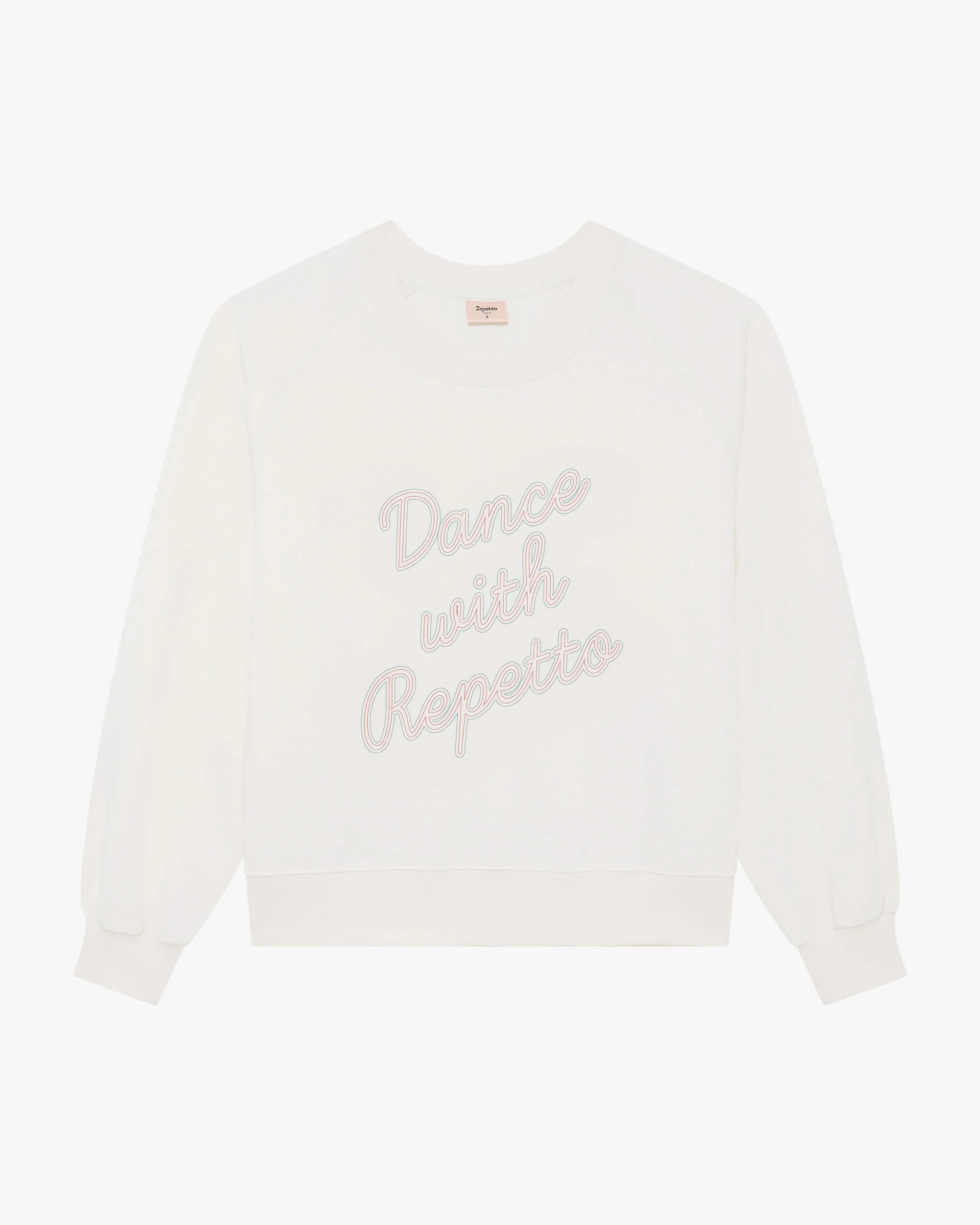 Smooth on outside and fleecy on the inside, this soft and mid-weight French terry is a true promise of warmth and comfort. Material: Cotton Main: 89% Cotton – 11% Polyester Rib: 95% Cotton – 5% Elastane Color: Ivory Details: Embrace the vibrant and colorful spirit of the 80s with our Dance with Repetto capsule. A fusion of retro sophistication and elegance to accompany your every move with style. This crewneck sweatshirt is an iconic piece of our capsule collection. With its oversized fit and logo on the front, it's the perfect companion for your workout sessions or for a vintage and casual look every day. - Designed for an over-sized look—size down for closer fit - Ribbed cuffs and hem Ref: S0711-214-XS