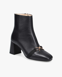 The irresistible Phoebe is here revisited with a flare heel and delicately adorned by a golden metallic bow, echoing the mythical ballerina lace, maintained by gros grain. Its lines will give a unique, retro touch while the metallic bow will bring feminity and sophistication. This everyday boot, with a rubber sole for comfort and resistance, maintains the artisanal approach as can be expected with our Maison. Material: Nappa calfskin Color: Black Heels height: 6 cm Original country: Portugal Details: Insole and lining in lambskin leather. Leather wrapped heel. Butt leather sole. Sacchetto construction. Benefits of the selected manufacturing process: The sacchetto construction, noble and complex, is a manufacturing method involves sewing the soft leather of the lining like a small bag ('sacchetto' in Italian) and inserting it into the upper. Soft leather thus wraps the foot like a glove. Repetto deconstructs the shoe, removes all superfluous - buttress, shank, reinforcement - for a feat of comfort in everyday life. Ref: V4214VED-410-35