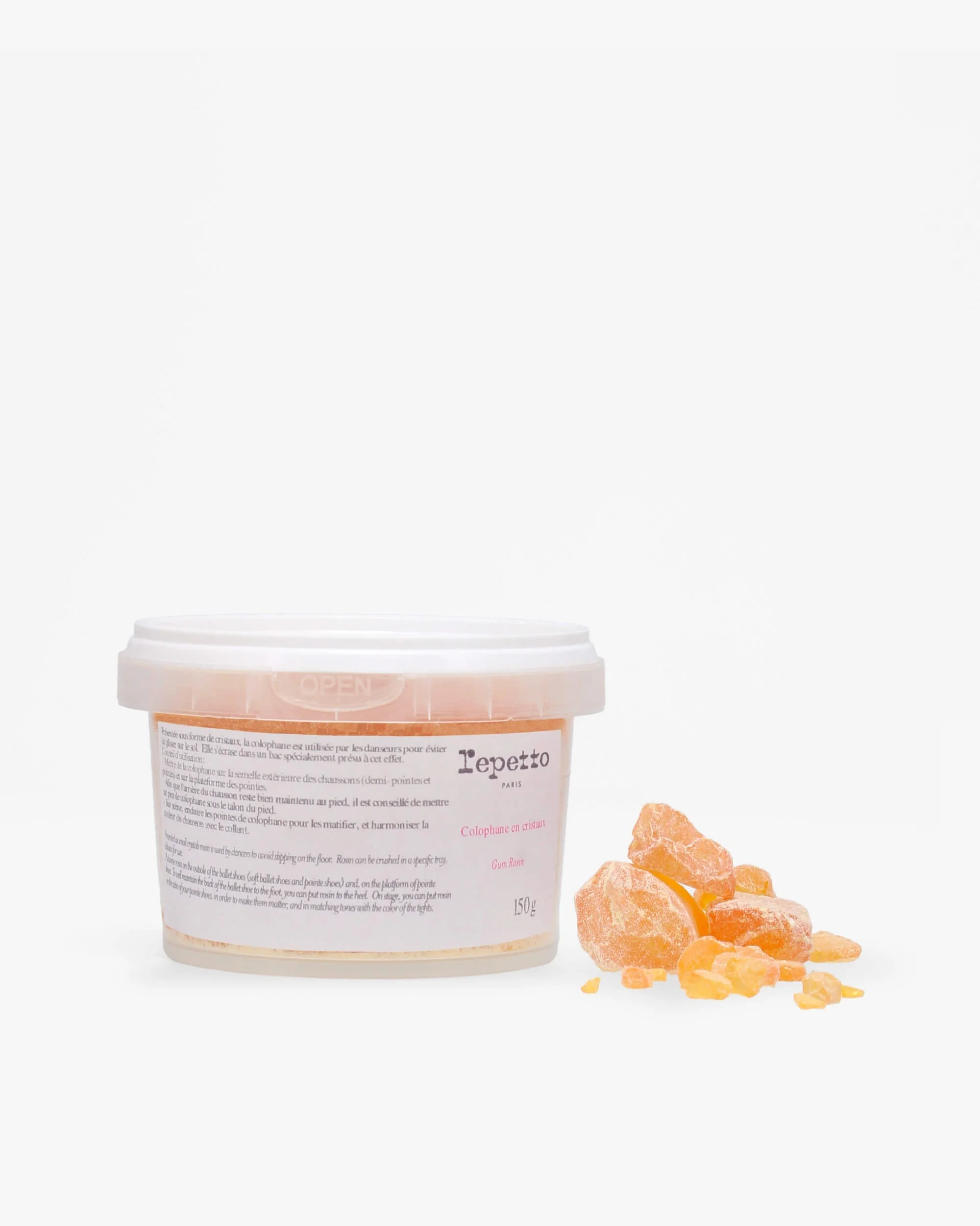 Presented in crystalline form, rosin is used by dancers to avoid slipping on the floor. It is crushed in a container specifically designed for this purpose. Directions for use: - Place the rosin on the outer sole of the shoes (ballet and pointe) and the toe platform. - To ensure that the shoe stays on the foot properly, it is advisable to put a little rosin on the heel of the foot. - On stage, spread the rosin on the pointes to reduce shine and match the colour of the shoe to the tights. (150g) Ref: A030-999