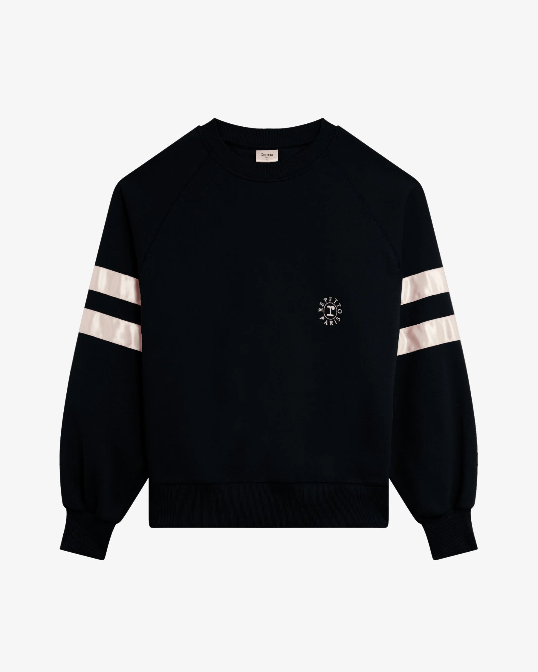 With its satin ribbons around the arms, this crew-neck sweatshirt is an iconic of the Repetto sportswear wardrobe Its oversize look makes it a must to take you from practice to street with style. Designed for an over-sized look—size down for closer fit Ribbed cuffs and hemMaterial:Molleton interieur gratte Composition:Main: 89% Cotton – 11% Polyester Rib: 95% Cotton – 5% Elastane Color:Black Original country:Portugal Ref: S0573A-410-XS Product details Round neckline. Loose fit. Low armholes. Satin stripes on sleeves. Embroidered "Rosace" logo on chest.