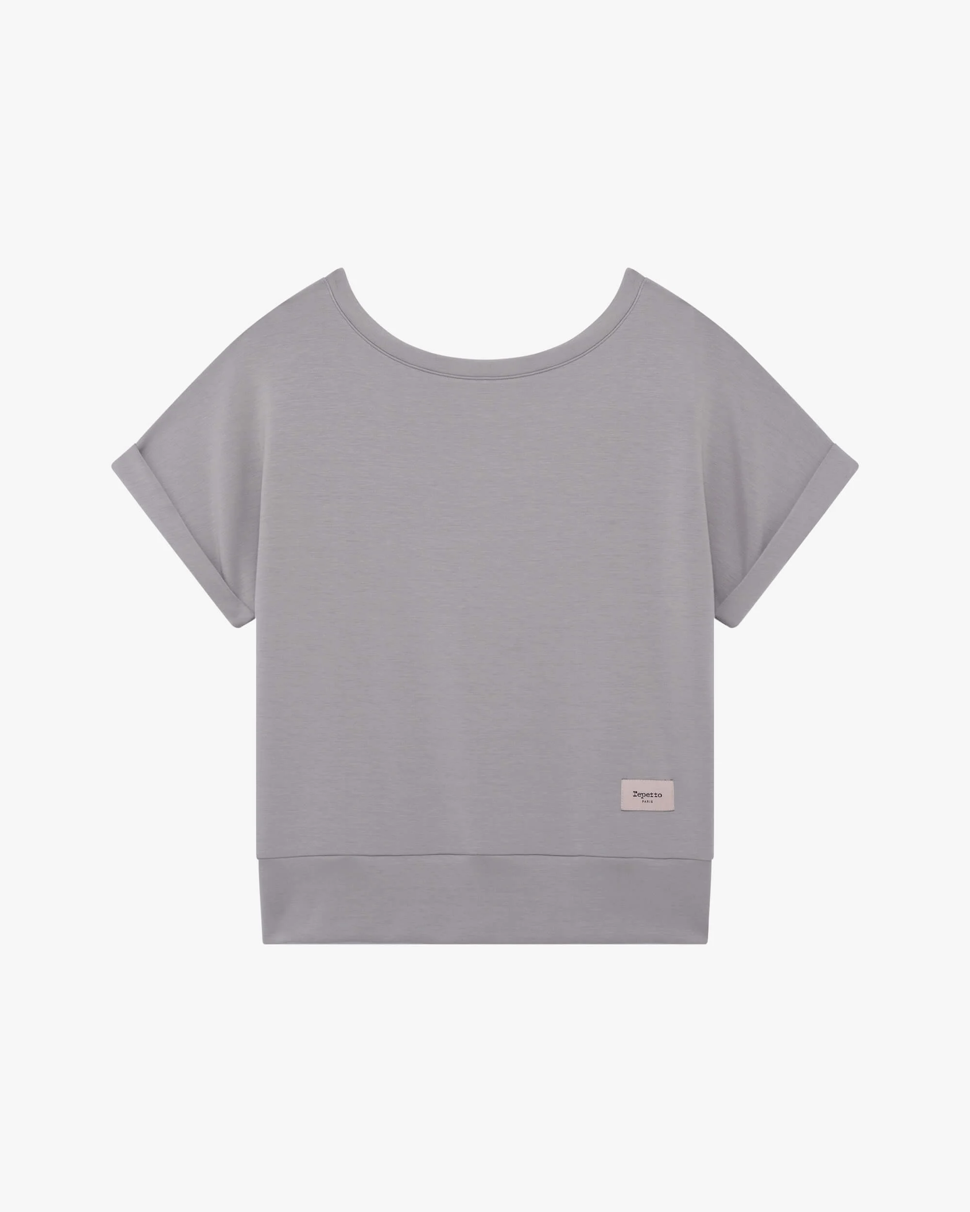 A soft and lightweight knit, featuring a dual construction with two distinct textures: plush viscose on one side and absorbent polyester on the other, delivering comfort and elegance with every movement. Material: Viscose 40% Viscose – 54% Polyester – 6% Elastane Color: Black Details: This loose-fitting, short-sleeved top effortlessly follows every move. Designed for both activity and daily wear, its oversized cut with androgynous charm envelops you in comfort, perfectly embodying the essence of Repetto's Activewear. • Oversized fit • Short sleeves with cuffs Ref: S0651N-1403-XS