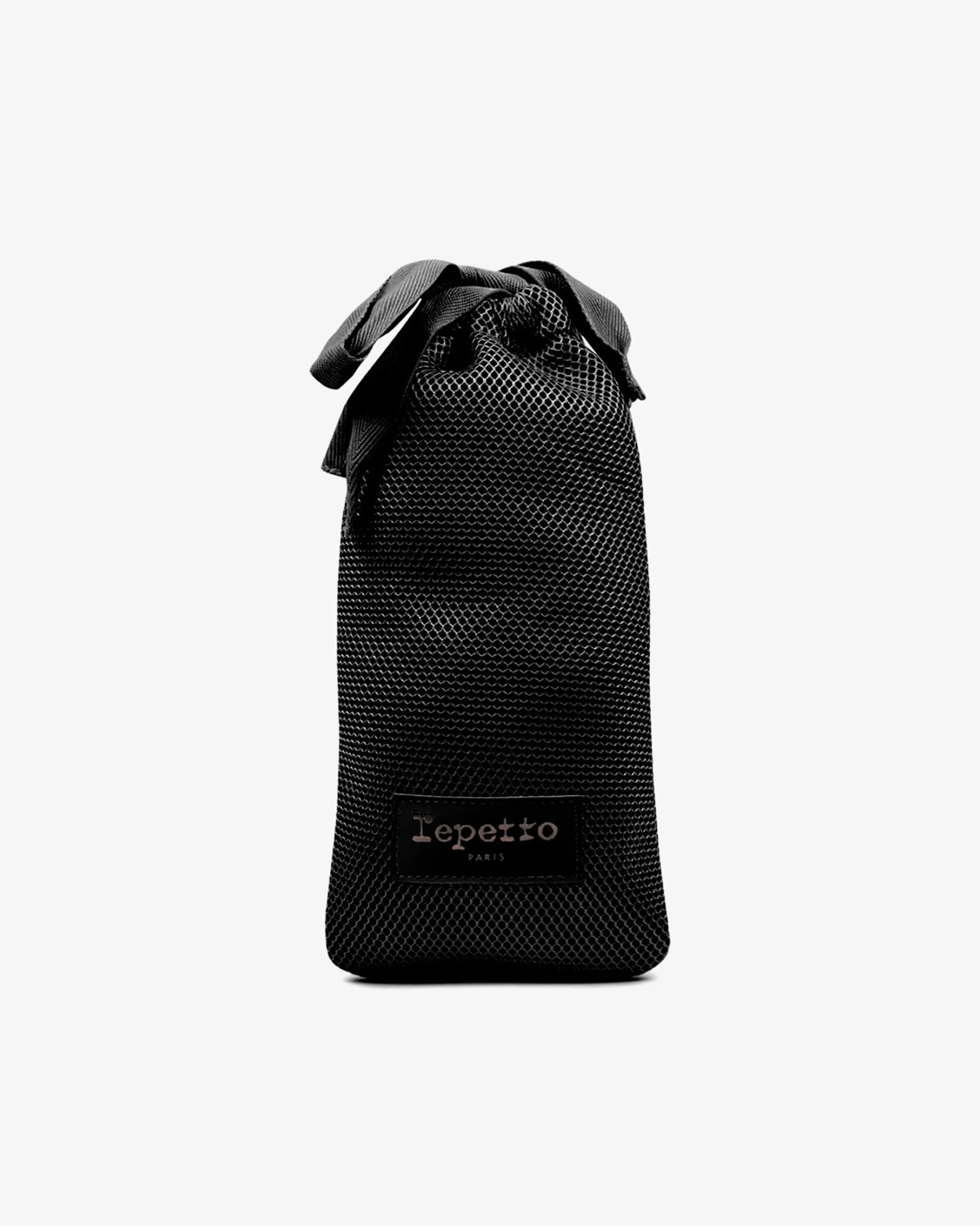 This pouch is useful to carry the ballet shoes. The mesh fabric brings breathability to the model. The grosgrain ribbons to tighten are a subtle and delicate reminder of the ballet codes. Material: Mesh Color: Black Dimensions: Height 32 cm x Width 16 cm Carried: Clutche Details: Closed by grosgrain ribbons. Gum label with pink gold Repetto logo. Ref: B0360M-410 Product details Closed by grosgrain ribbons. Gum label with pink gold Repetto logo.