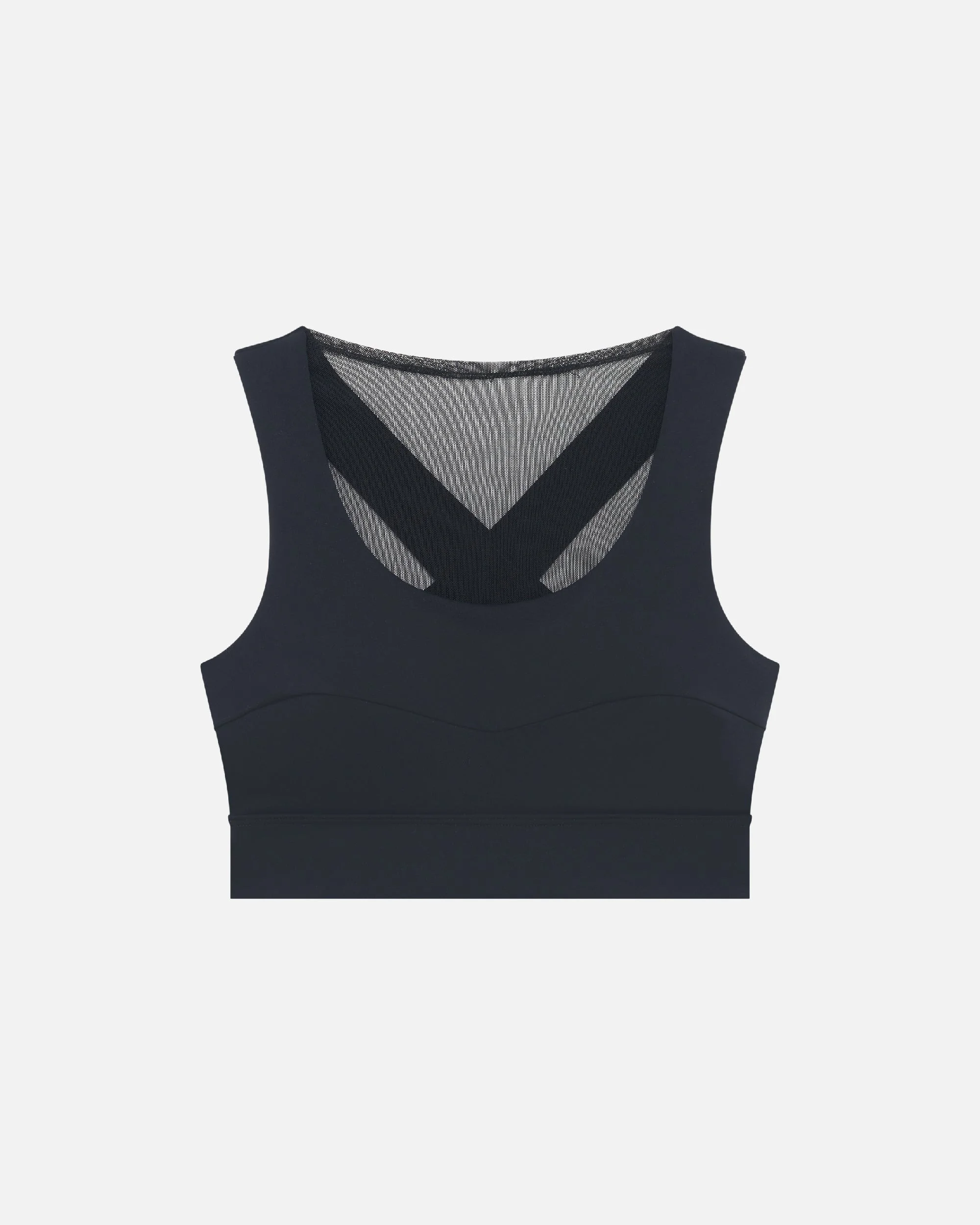 Designed in an ultra-soft technical fabric, this bra perfectly shapes the upper body and ensure strong support while practicing The mix of large straps and mesh fabric at the back gives an elegant and fzminine silhouette Large straps crossing at the back Elastic band around the bust for more support Padding included for more comfort and opacityMaterial:Maille Active Soft Composition:Main : 73% Polyamide - 27% Elastane Lining : 76% polyamide - 24% Elastane Tulle : 91% Polyamide - 9% Elastane Color:Black Original country:Tunisia Ref: S0630-410-XS Product details -