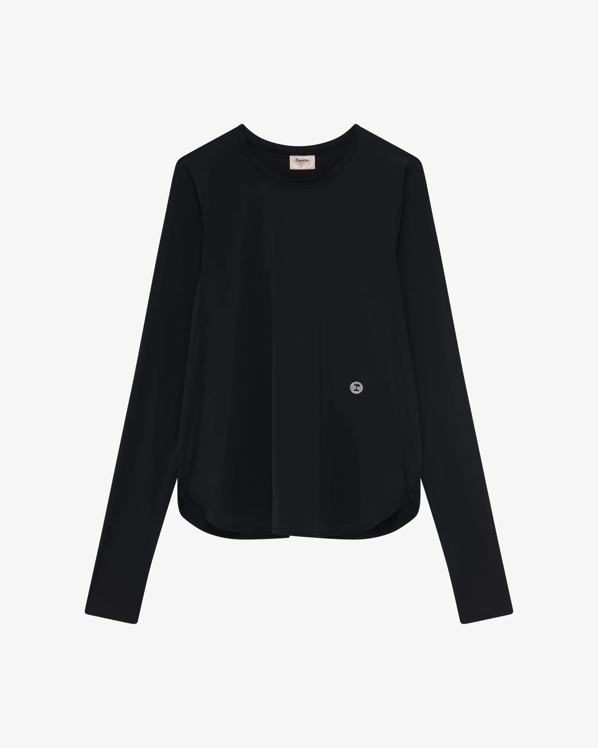 Designed in an ultra-soft and silky-like fabric, this long sleeve top can be worn over a bra for practice. It can also be matched with a classic pant for effortless, everyday wear. Round neck Straight fit with rounded cutouts on the side Long sleeves with thumb-holesMaterial:Maille Active Silk Composition:76% Polyamide - 24% Elastane Color:Noir Original country:Tunisia Ref: S0687-410-XS Product details This airy and ultra-fine fabric feels extremely soft and light.