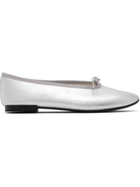 Grained leather ballerina flats. · Almond toe · Bow accent at vamp · Grosgrain trim at collar · Twill lining · Stacked leather heel with rubber injection · Rubber sole Supplier color: Silver Upper: leather. Sole: rubber. Made in France 252296F118006
