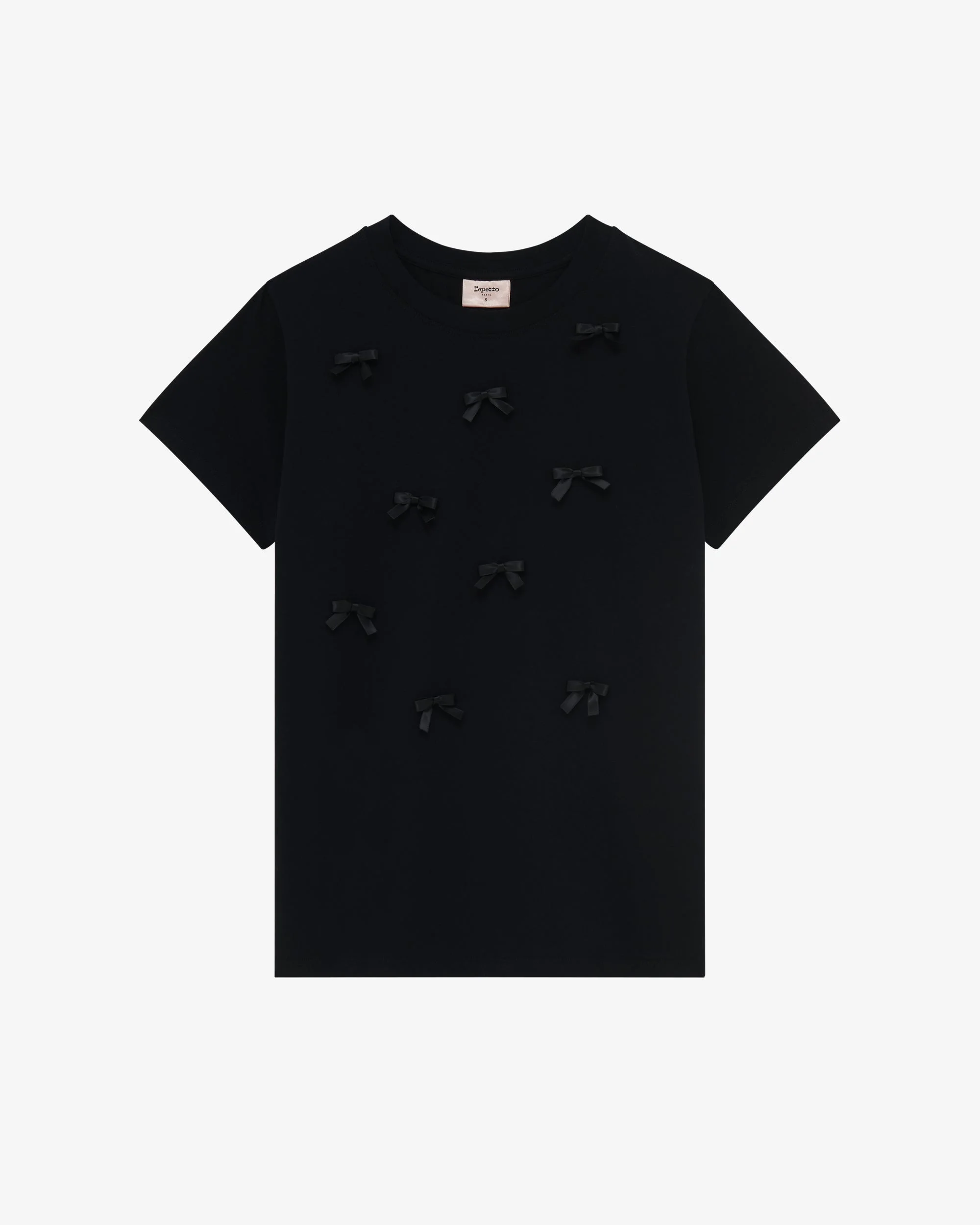 Modern interpretation of the ballet world, this classic crew-neck tee-shirt is embellished with multiple satin ribbon bows, randomly placed on the front. With its short sleeves and regular fit, it is a must for an everyday wear with pants, or a more sophisticated look with a Jupon tutu skirt. Rounded neck Short sleeves Regular fitMaterial:Coton Bio Composition:100% Organic Cotton Color:Noir Original country:Portugal Ref: S0681-410-XS Product details Made of organic cotton, this mid-weight jersey knit is extra-soft and comfy for an everyday comfort.