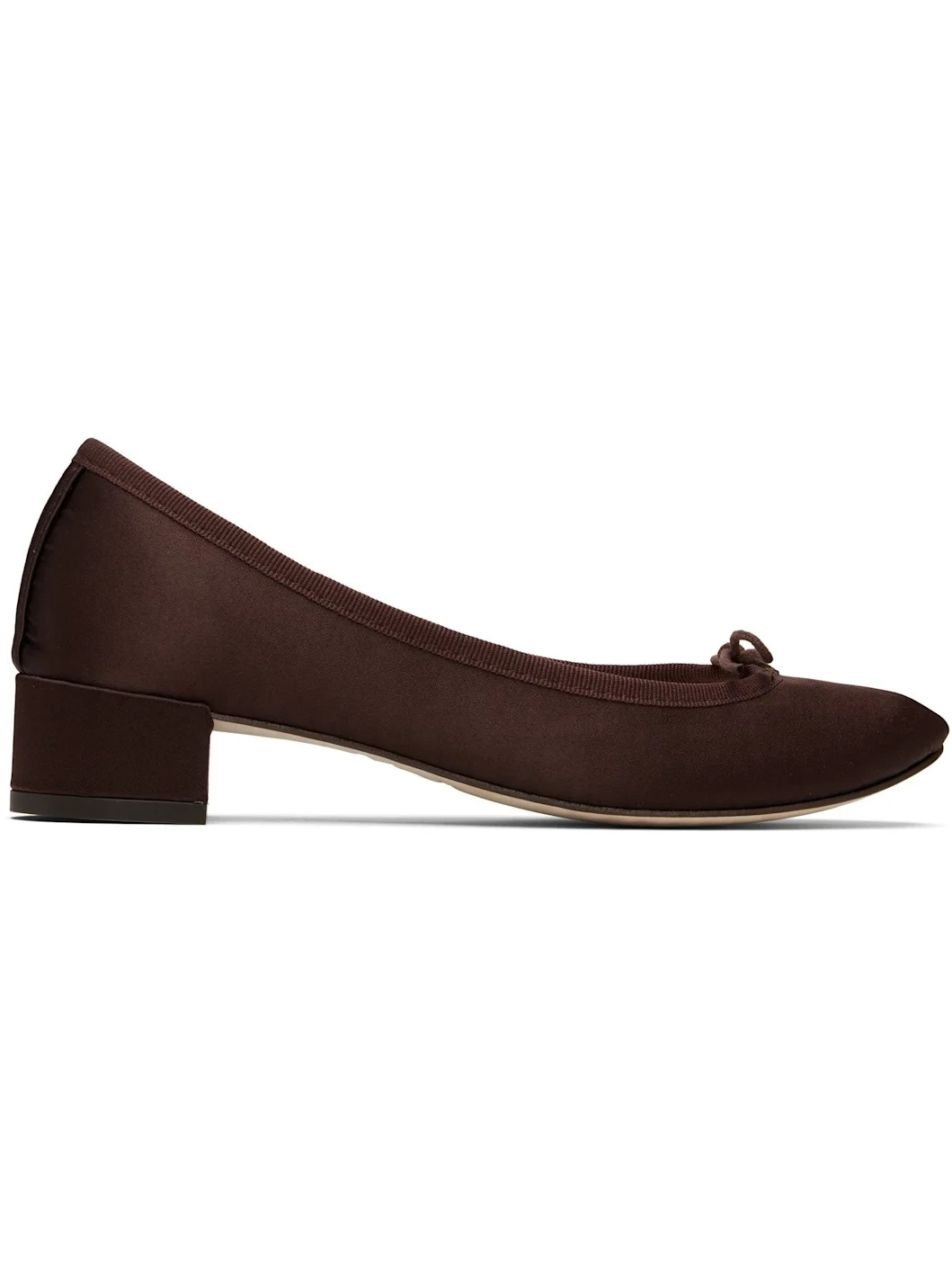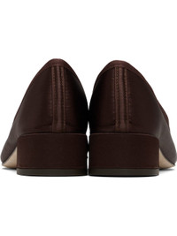 Satin heels. · Bow accent at vamp · Grosgrain trim at collar · Twill lining · Covered block heel with rubber injection · Leather sole · Heel: H1.25" Available exclusively at SSENSE. Supplier color: Deep mocha Upper: textile. Sole: leather, rubber. Made in France 251296F122030