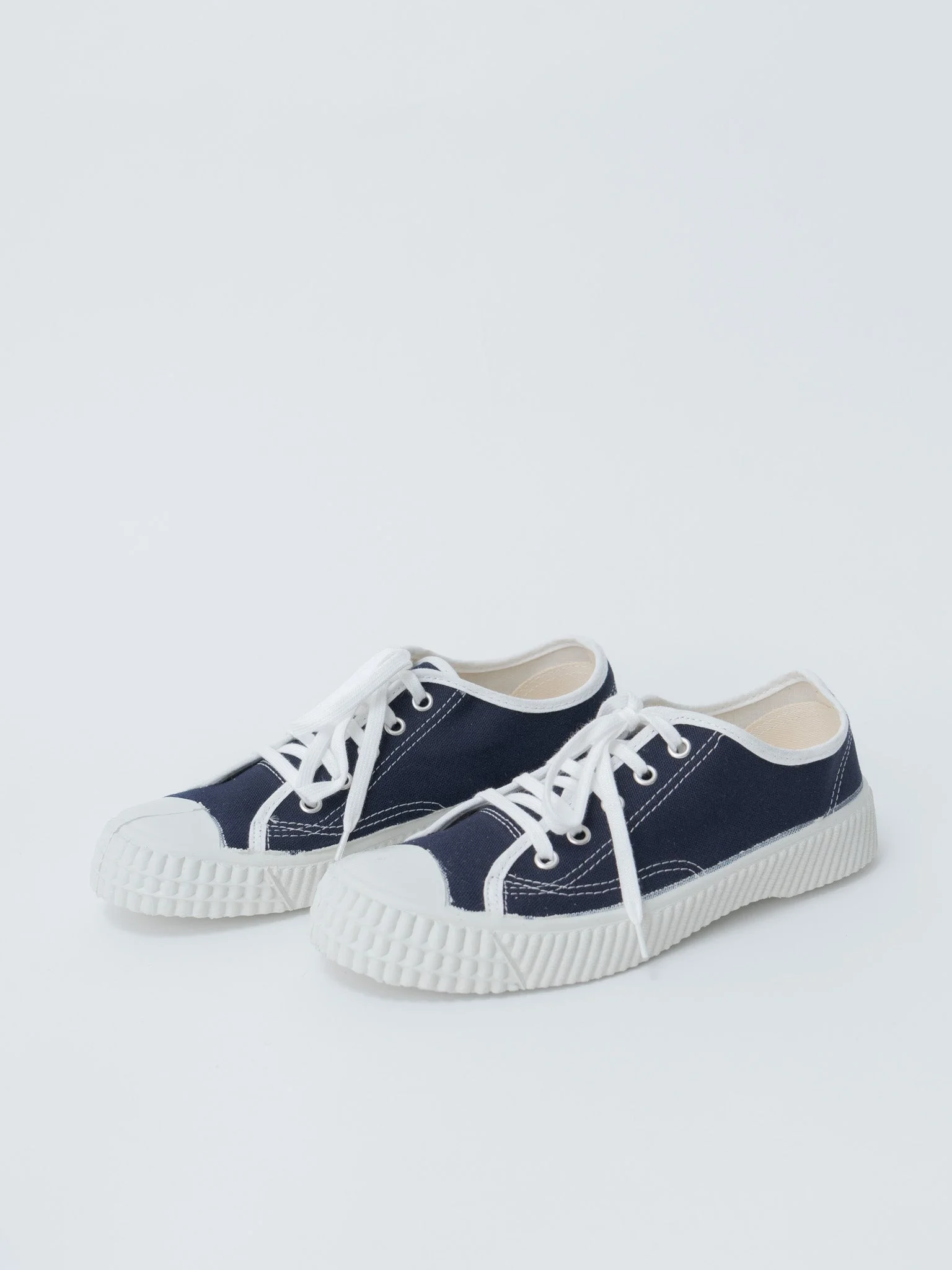 The 900F Military Trainer is a modern reproduction of Soviet Army training shoes from the 1980s, crafted using the durable vulcanized manufacturing method. It features a cotton canvas upper sourced from a historic fabric mill, and the sole is made with a vintage 1970s mold for an authentic shape and structure. Composed of high-content natural rubber, the sole is highly flexible and comfortable, allowing the shoe to be easily bent in half. - Made in Slovakia - Cotton upper / rubber sole - Available in Navy/White - EU sizing - true to size. If in between sizes, we recommend sizing up. - For larger sizes, please check here