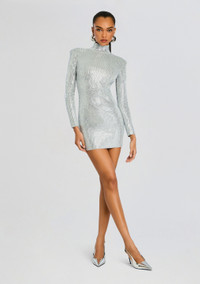 Experience a night out in luxury with our Aisling Embellished Dress. Adorned with all-over embellishments, this long-sleeved high neck mini dress is the epitome of elegance. Perfect for a sophisticated and exclusive look, make a statement and turn heads in this dazzling dress. - 54.5% Nylon, 20% PPT, - 16% Acrylic, 9.5% Wool - Made in China - Model is 5'10 wearing size S - Style No. HL25-10838