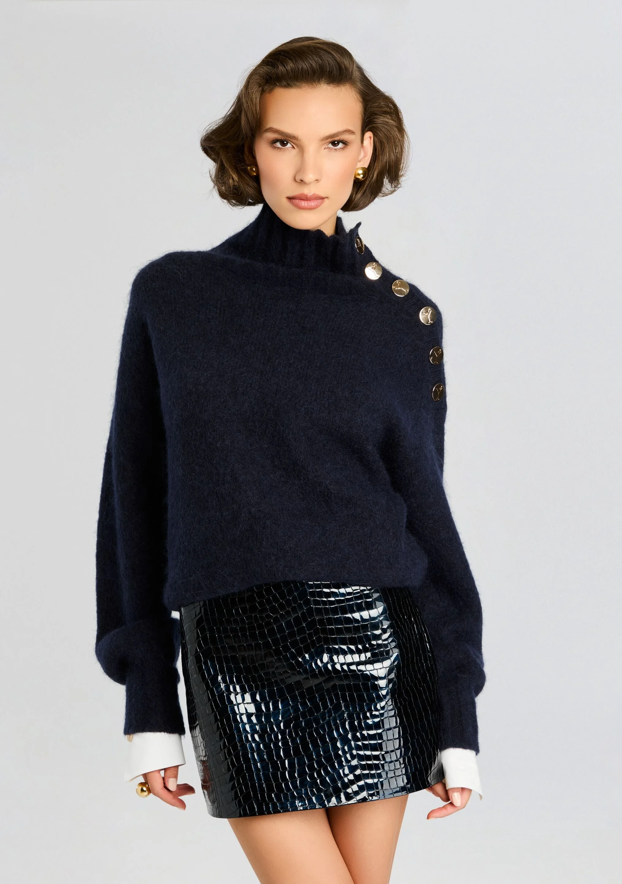 Our luxurious Amalia sweater is an essential piece for any wardrobe. The perfect blend of comfort and style, this sweater is crafted from a soft, wool-blend fabric that will keep you warm and cozy all season long. It's a classic and timeless piece that can be dressed up or down, making it a versatile option for any occasion. Shown here in Ink/Navy. - 33% Wool, 33% Mohair, 28% Nylon, 6% Spandex - Made in China - Model is 5'10" wearing size S - Style No. - FW24-10208
