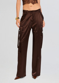 The Andre Pant is a glamorous twist to the on-trend cargo pant. Our version features the utilitarian details—side pockets and a wide leg—reimagined in a silky fabrication, perfect for going out. Shown here in Dark Chocolate. - 76% Acetate, 24% Polyester - Made in China - Model is 5'11" wearing size S - Style No. - SS23-6539