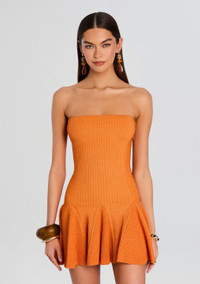 Turn heads in our Annina Dress, a statement piece designed to make you feel confident and stylish. This figure-hugging dress features a trendy strapless neckline and a playful ruffle hem. The orange hue adds a touch of glamour, making it perfect for a night out with friends or a special occasion. Crafted from a comfortable and flattering knit fabric, the Annina Knit Dress is both chic and easy to wear. Shown here in Metallic Aperitivo. - 60% Rayon, 32% Nylon, 3% Spandex, 5% Metallic - Made in China - Model is 5'10" wearing size S - Style No. PF24-9299
