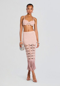 Make a statement with the Bellini Crochet Top. This stunning crop top is handcrafted with intricate crochet and adorned with beautiful beads, adding a touch of bohemian glamour to any outfit. Pair it with the matching Naida Crochet Skirt for a head-turning festival look. Shown here in Metallic Peche - 56% Acrylic, 20% Polyester, 14% Nylon, 10% Metallic - Made in China - Model is 5'10" wearing size XS/S - Style No. - PF24-9601