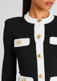 Wrap yourself in luxury with the Calla Bandage Knit Top. This elegant jacket features a button front and gold hardware, adding a touch of sophistication to any outfit. Made with bandage knit fabric, it's not only stylish but also comfortable. Pair it with the Ashton Short for a complete, high-end look. - 60% Rayon, 32% Nylon, 3% Spandex, 5% Metallic - Made in China - Model is 5'10" wearing size S - Style No. FW24-10044