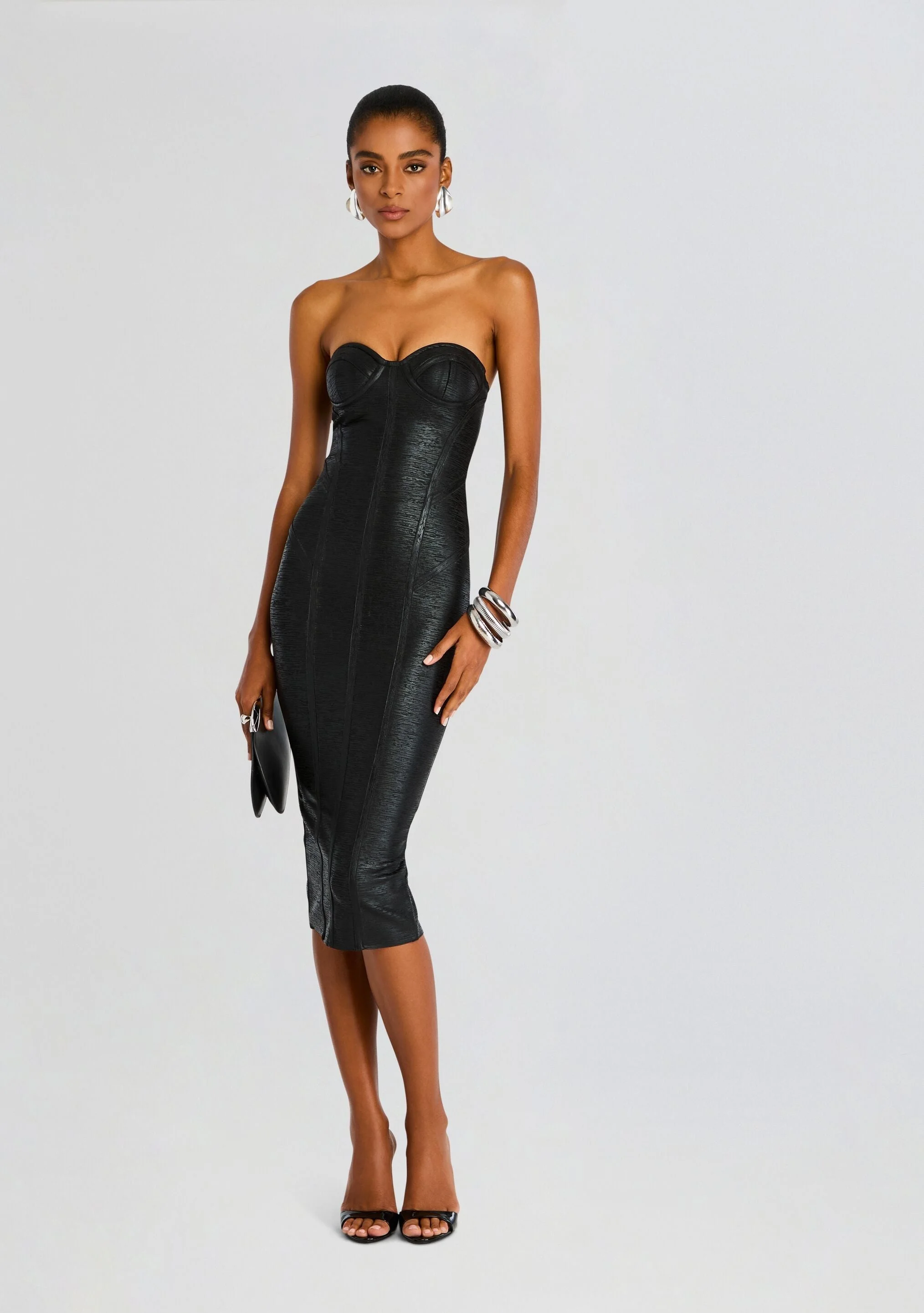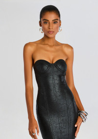 Experience the luxury of Charlize Dress, meticulously crafted for a flattering silhouette and a comfortable fit. The fusion of knit fabric and the coated denim finish provides a unique texture and a head-turning look, setting you apart in any crowd. Make every occasion special, turning heads and capturing hearts with this iconic ensemble. Shown here in Coated Black. - 90% Polyester, 10% Spandex - Made in China - Model is 5'10" wearing size S - Style No. FW23-7685