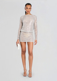 Command attention in the dazzling brilliance of the Danae Crystal Dress. This captivating mini is adorned with shimmering crystals, creating an aura of opulence and glamour. Its luxurious embellishments and figure-hugging silhouette make it an unforgettable choice for a special occasion. Shown here in White/Silver. - Handmade Crystal Embellishments - 100% Nylon - Made in India - Model is 5'10" wearing size S - Style No. - FW24-10035