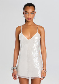 Unleash your inner glamour with the Deserae Sequin Dress. This luxurious mini dress features shimmering sequins, a sultry v-neckline, and delicate spaghetti straps. Effortlessly elevate any occasion with this timeless and elegant piece. Shown here in Pearl. - 100% Polyester - Made in China - Model is 5'10" wearing size S - Style No. - PF24-9361