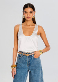 Perfect for layering or as a standalone top, the Dori Top is a chic, silky, scoop neck that combines timeless style with unbeatable luxurious comfort, making it an essential addition to your wardrobe. Shown here in Bone. - 95% Silk, 5% Spandex - Made in China - Model is 5'11" wearing size S - Style No. SS24-8666