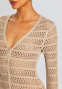 Experience effortless style and versatility in SER.O.YA's Dorothea Cardigan. This knit crochet cardigan features a long silhouette and front button closures perfect for layering over the May Top and Marjorie Maxi Skirt or closed as a dress. Shown here in Oxford. ABOUT SER.O.YA Established in 2020, SER.O.YA is a New York-based ready-to-wear label founded with the intention to upgrade and refine your wardrobe. With a focus on crafting effortlessly cool and timelessly luxurious designs—SER.O.YA creates minimalist collections powered by maximum style. Everyday essentials in the form of breathable knits, vintage inspired denim, and ultra-luxe fabrications are interchangeably worn for easy dressing that never compromises. With versatility at its core, the brand’s simple yet significant aesthetic comes through in classic silhouettes that are anything but conventional. - 72% Rayon, 28% Polyester - Made in China - Model is 5'10" wearing size S - Style No. 3687-19