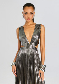 Introducing the exquisite Dracey Dress - a spectacular lame gown with a plunging neckline and intricate cutout details. Perfect for special occasions, this dress exudes elegance and sophistication. Elevate your wardrobe with this exclusive piece and make a statement wherever you go. - 95% Polyester, 5% Spandex - Made in China - Model is 5'10 wearing size S - Style No. - R25-10777