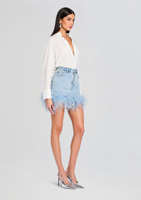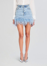 The Elvie Denim Skirt is the perfect choice for a stylish night out. With its luxurious fur trim and sleek denim design, this skirt adds a touch of elegance to any outfit. Embrace a sophisticated and exclusive look with this must-have piece from our premium fall collection. - Denim skirt with detachable feather trim - 98% Cotton, 2% Elastane - Ostrich feather trim - Made in China - Model is 5'10" wearing size 25 - Style No. FW24-10383