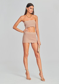 The Ember Top by SER.O.YA is a cotton knit bandeau featuring light distressing throughout. The ribbed top and bottom trim adds support. Wear it with the Alora Skirt for an ultra-sexy look. Shown here in Natural. About SER.O.YA Established in 2020, SER.O.YA is a New York-based ready-to-wear label founded with the intention to upgrade and refine your wardrobe. With a focus on crafting effortlessly cool and timelessly luxurious designs—SER.O.YA creates minimalist collections powered by maximum style. Everyday essentials in the form of breathable knits, vintage inspired denim, and ultra-luxe fabrications are interchangeably worn for easy dressing that never compromises. With versatility at its core, the brand’s simple yet significant aesthetic comes through in classic silhouettes that are anything but conventional. - 100% Cotton - Made in China - Model is 5'10" wearing size S - Style No. 1978-12