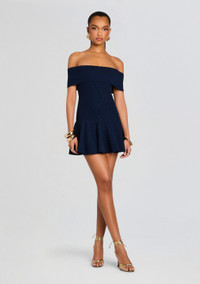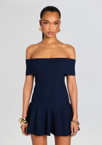 Introducing our Erica Dress, the epitome of girly sophistication with a touch of flair. Elevate your wardrobe with this charming piece that seamlessly combines feminine details, and timeless elegance. Crafted from knit fabric, this mini dress offers a figure-flattering bodycon fit that hugs your curves in all the right places. The off-the-shoulder neckline adds a flirty and feminine touch, while the flare at the end adds a hint of movement and charm. Shown here in Metallic Navy. - 60% Rayon, 32% Nylon, 3% Spandex, 5% Metallic - Made in China - Model is 5'10" wearing size S - Style No. SS24-9572