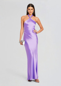 Step into a realm of elegant style with our ethereal Ester Dress. This halterneck top features two tie elements at its back and a mermaid silhouette skirt. Shown here in Wisteria. - 76% Acetate, 24% Polyester - Made in China - Model is 5'10" wearing size S - Style No. PF23-7229