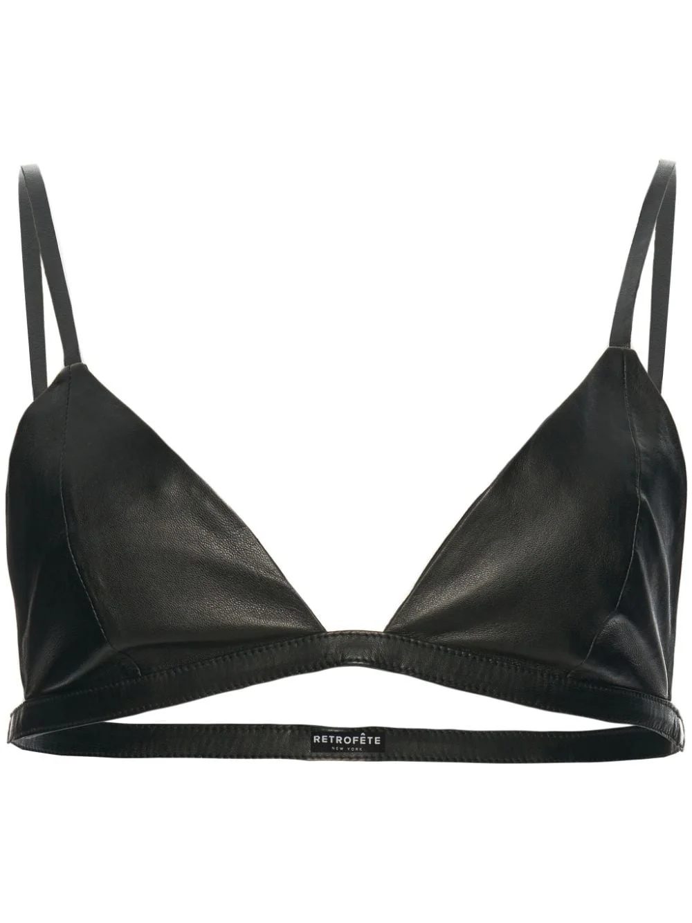 Esti leather bra Highlights - Black - Leather - Triangle shape - Logo underband - Spaghetti straps - Adjustable shoulder straps Imported Composition Leather 100% Washing instructions Specialist Cleaning