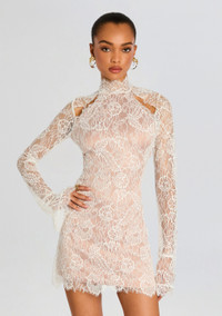 Elevate your evening ensemble with our Gilana Dress, featuring sheer lace detail, long sleeves and a sultry zip back closure. Designed to accentuate your curves and exude sophistication, this dress is a perfect addition to your wardrobe. The subtle cutouts on the collar bones add a touch of allure, making it the perfect choice for a night out or a special occasion. Crafted from delicate lace, this dress offers both elegance and comfort, ensuring you feel confident and glamorous all night long. Shown here in White. - 100% Polyamide - Made in China - Model is 5'10" wearing size XS - Style No. - SS24-8001