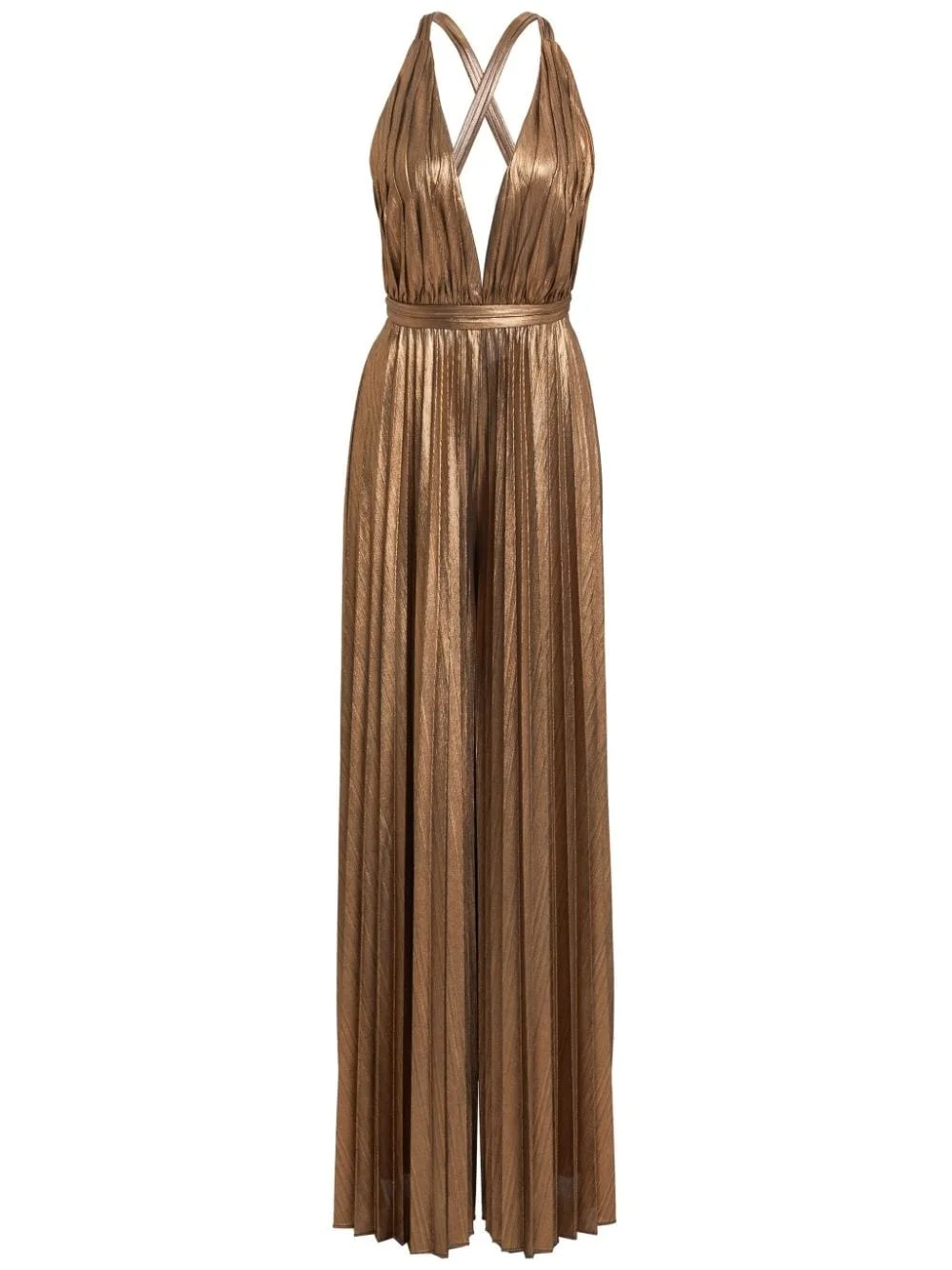 Graciane pleated plunge jumpsuit Highlights - Bronze-tone - Stretch-design - Metallic finish - Fully pleated - Plunge style - Sleeveless - Rear criss-cross straps - Rear tie fastening - Wide leg Imported Composition Polyester 95%, Spandex/Elastane 5% SIZE & FIT FittingInformation Designed for a close fit at the chest and waist, but loose at the hip Made from a midweight stretch fabric, this piece offers elasticity and flexibility when worn This piece fits true to size – take your usual size Washing instructions Dry Clean Only