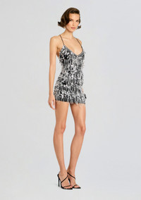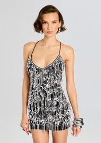Step into the spotlight with our Haven Dress. Embrace the allure of glamour and sophistication with this statement piece that promises to make heads turn at any event. The sequin feather embellishments add a touch of edge, while the fringe sequin details create movement and drama with every step you take. The sultry open back adds an unexpected twist to the timeless silhouette, ensuring you'll make a lasting impression wherever you go. Whether you're attending a cocktail party, a formal event, or a night out on the town, this dress is guaranteed to steal the show. Shown here in Silver/Black. - HANDMADE - Hand-stitched sequin and chain embellishments - 100% Nylon - Made in India - Model is 5'11" wearing size S - Style No. - SS24-9226