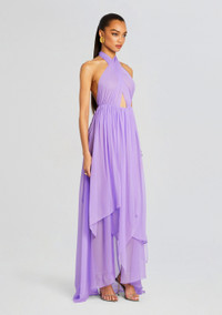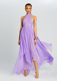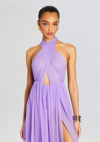 Radiate confidence with our Ina Silk Chiffon Dress. This bright, flowy masterpiece features a crossover-neck design, mini center cutout, and daring thigh-high slits that will have heads turning. Shown here in Wisteria. - 100% Silk - Made in China - Model is 5'10" wearing size S - Style No. SS23-6520