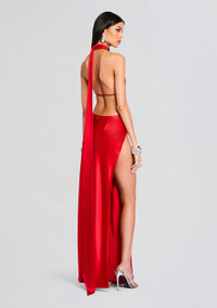 Our Jagger Dress is a seductive silk gown. Punctuated by high slits on each side and an open back, this ultra-sexy silhouette maintains an air of refinement thanks to its high neck. Shown here in Red. - 76% Acetate, 24% Polyester - Made in China - Model is 5'10" wearing size XS - Style No. HL23-5772