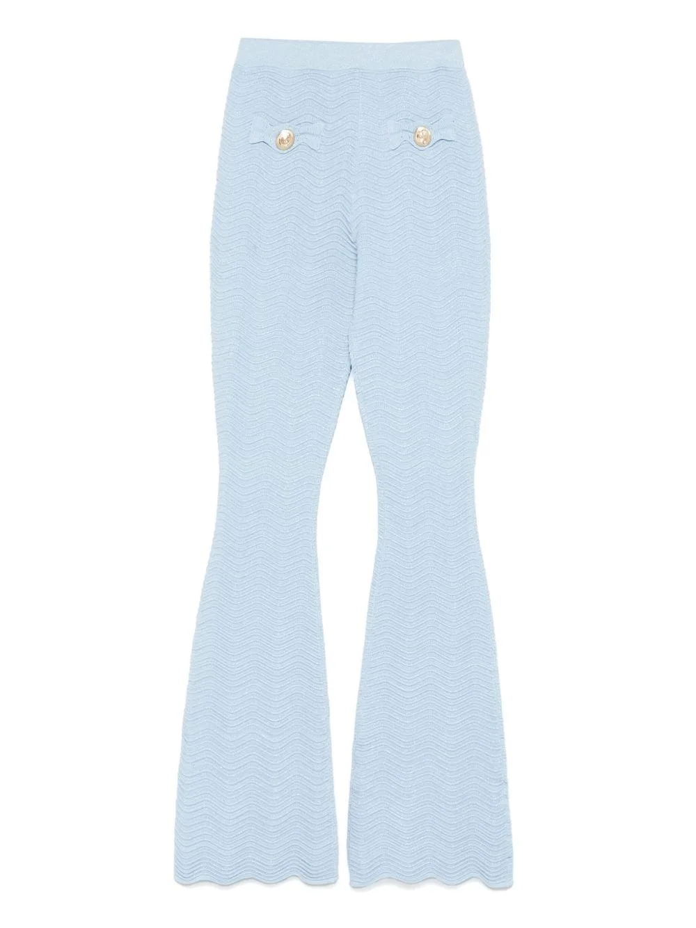 Joliet trousers Highlights - Light blue - Elasticated waistband - Decorative button detailing Imported Composition Rayon 60%, Nylon 32%, Metallised Fibres 5%, Spandex/Elastane 3% SIZE & FIT Model measurements Height 5 ft 10 in(1.79 m) Bust/Chest 33.07 in(84 cm) Hips 35.82 in(91 cm) Waist 24.01 in(61 cm) FittingInformation Designed with a flared hem, these trousers allow for a close fit at the waist with a slim fit over the leg and widening towards the hem The elasticated waist allows for a comfortable fit Made from a midweight stretch fabric, this piece offers elasticity and flexibility when worn