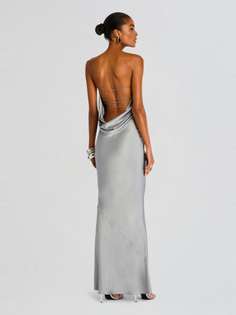 Indulge in elegance and allure with our Keaton Dress. Elevate your style with this exquisite gown boasting a flattering strapless neckline, an alluring open back, and crafted from a sumptuously silky fabric. Designed to captivate attention, this dress embraces sophistication and sensuality. The strapless silhouette offers a chic and elegant appeal while the open back adds a touch of allure, ensuring you radiate confidence and charm. Shown here in Earth. - 95% Silk, - 5% Spandex - Made in China - Model is 5'10" wearing size S - Style No. WEB-6560