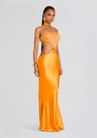 Redefine elegance with our Lucie Dress. This gown epitomizes grace and sophistication, offering a perfect blend of modern design and timeless allure. The intricate lace and cutouts create an exquisite pattern that adds a dimension of mystery and style. The open back design and turtle neck feature balance sensuality and modesty, making this gown ideal for upscale events, galas, or weddings. Shown here in Aperitivo. - 76% Acetate, 24% Polyester - Made in China - Model is 5'10" wearing size XS - Style No. - WEB-8000
