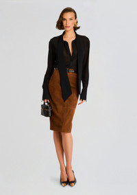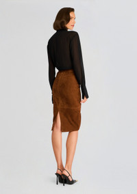 Our Marcella Suede Skirt is a timeless piece that will elevate any outfit. Crafted from luxurious suede, this skirt features a flattering A-line silhouette that falls just above the knee. The skirt is finished with a delicate zip closure and a stylish side slit. Shown here in Cinnamon. - 100% Goat Leather - Made in India - Model is 5'10" wearing size S - Style No. - FW24-9718