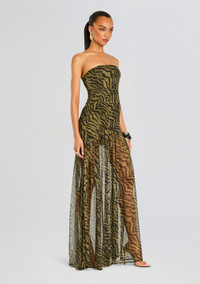 Walk on the wild side with our Nicole Dress. This strapless maxi dress features a fierce tiger print with bias-cut, frayed panels throughout the bodice, and a romantic, sheer skirt. A zipper located on the side completes the look. Embrace your adventurous spirit with this captivating dress- crafted to demand attention, this strapless maxi dress boasts a stunning tiger print that exudes fierceness and confidence. Shown here in Tiger Stripe. 100% Silk Made in China Model is 5'10" wearing size S Style No. FW22-5555