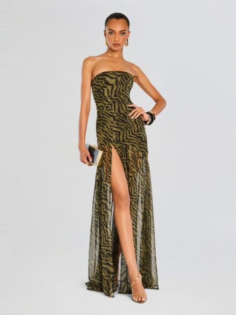 This strapless maxi dress features a tropical leaf print with bias-cut, frayed panels throughout the bodice, and a romantic, sheer skirt. A zipper located on the side completes the look. Shown here in Tropical Leaf. - 100% Silk - Made in China - Model is 5'11" wearing size XS - Style No. FW22-5555