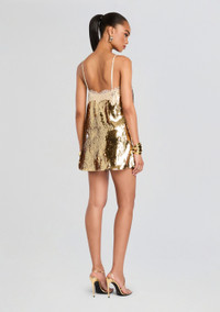 Radiate elegance in our Olive Dress. This luxurious cocktail dress features a delicate lace bodice with a flattering, all over sequin silhouette. The adjustable straps ensure a perfect fit, while the flowing silhouette creates a graceful and feminine look. Shown here in Gold. - 100% Polyester - Made in China - Model is 5'10" wearing size S - Style No. PF24-9570