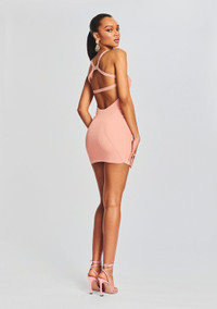 Step out with confidence in our Sumner Dress. This stunning mini-ensemble incorporates an intricate rib knit pattern and a cross strap open back featuring a golden buckle detail. Shown here in Dusty Peach. - 6 - 0% Rayon, 32% Nylon, 3% Spandex, 5% Metallic - Made in China - Model is 5'10" wearing size S - Style No. PF23-7026