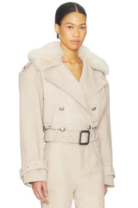 - Self: 100% genuine goat leather Lining & Faux Fur Trim: 100% polyester - Made in India - Specialty leather cleaner only - Button down and belt buckle closure - Side seam pockets - Shoulder pads - Fur-lined shoulder flap - Belted cuffs - Revolve Style No. ROFR-WO167 - Manufacturer Style No. R-HL26-12289-19