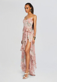 Channel your inner romance with our Samara Dress, featuring a whimsical ruffle hem, flowing silhouette, daring high slit, and captivating open back. Embrace the epitome of femininity and grace with this statement piece that promises to steal the spotlight at any occasion. Shown here in Dusty Pink Botanical. - 100% Silk - Made In China - Model is 5'10" wearing size S - Style No. - SS24-8855